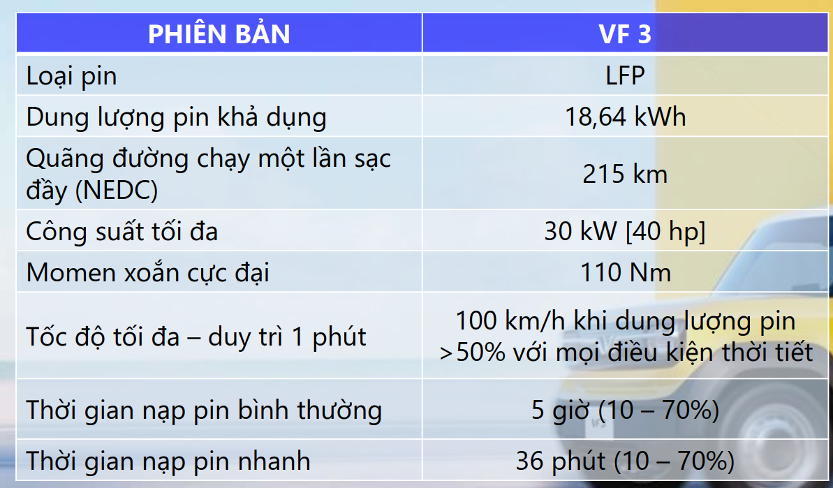 Vượt lên trên một phương tiện di chuyển thông thường, VinFast VF 3 là biểu tượng mới mang tính cách mạng trong cuộc sống đô thị. Với thiết kế hiện đại, hiệu suất vận hành linh hoạt, tính năng an toàn tiên tiến, cùng chi phí vận hành siêu rẻ, VF 3 sẽ mở ra một cách tiếp cận hoàn toàn mới trong việc lựa chọn phương tiện di chuyển hàng ngày, mang lại sự thuận tiện, dễ dàng và đặc biệt thoải mái cho tất cả mọi người.